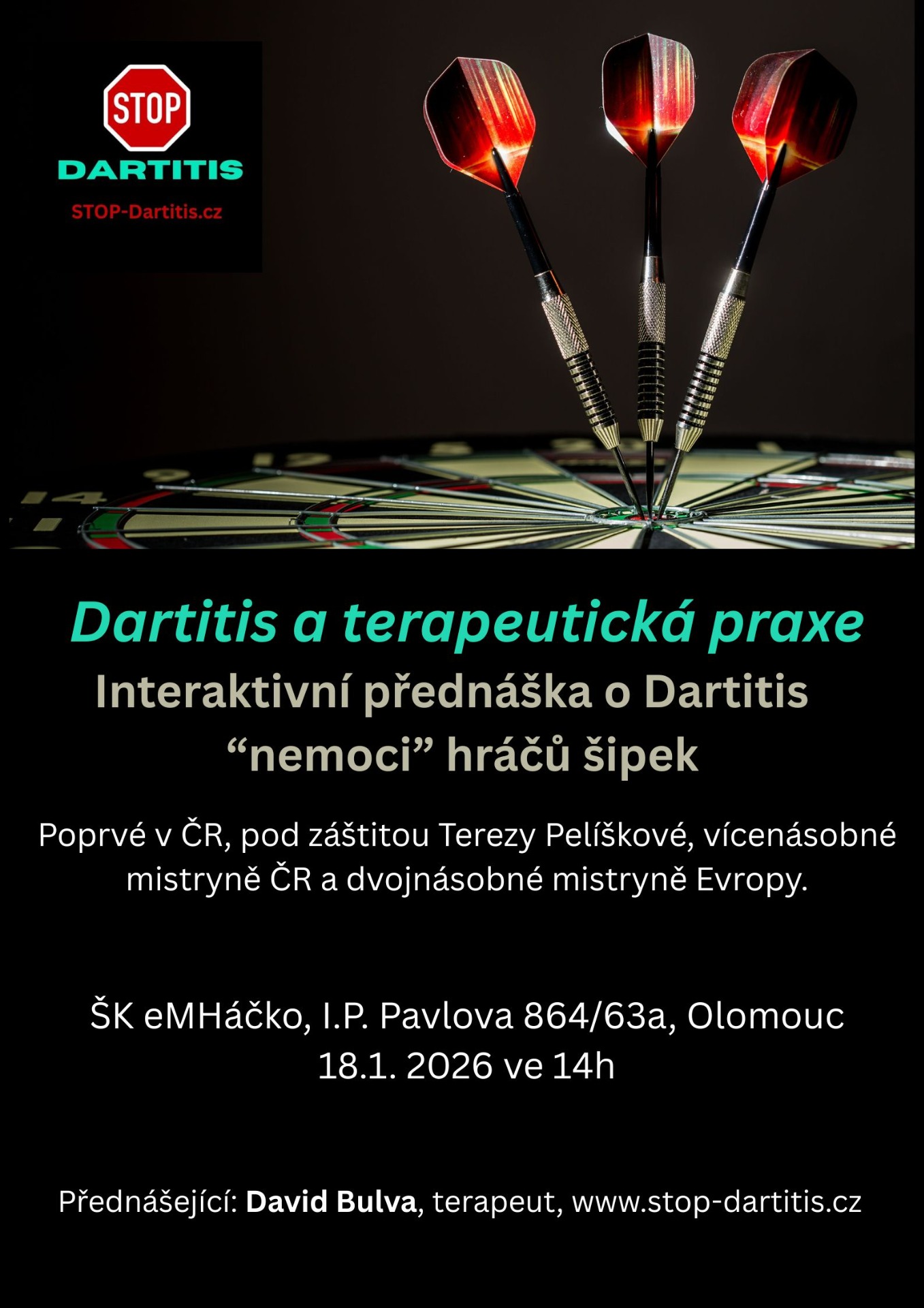 Přednáška bude s praktickými ukázkami, a proto hledám hráče, který aktuálně trpí Dartitis a sice formou, která je zřetelně viditelná, tj. ideálně NEMOŽNOST ODHODU, případně velmi snížená schopnost odhodu, PŘEPADÁVÁNÍ apod. Ale i jiné! Chci mimo jiné naživo ukázat základní postupy terap. práce. K tomu právě budu potřebovat "neléčeného" hráče s Dartitis, který bude ochoten se přednášky zúčastnit jako figurant. Napište nebo zavolejte na 605 519 943. Díky!